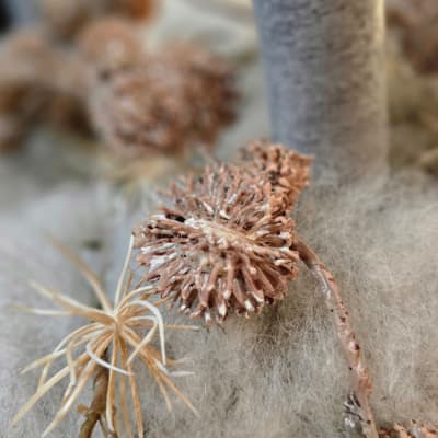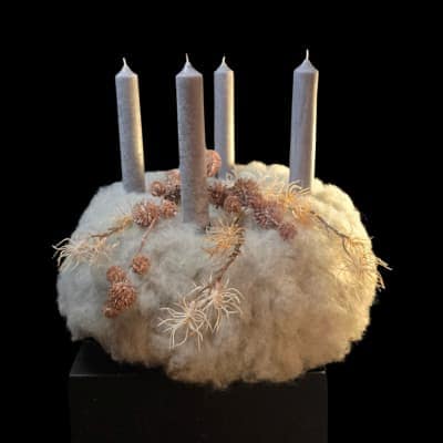 Wollkranz in warmem Grau mit vier Stabkerzen und künstlichen Fruchtständen in Naturtönen.