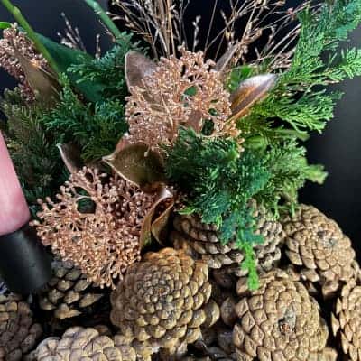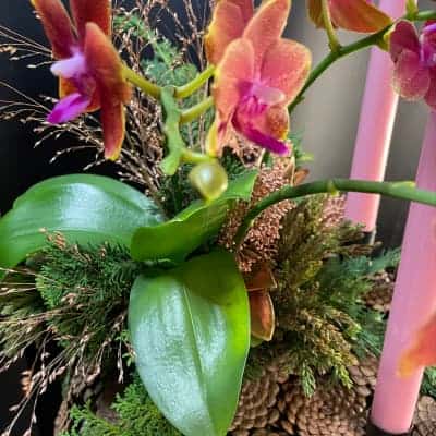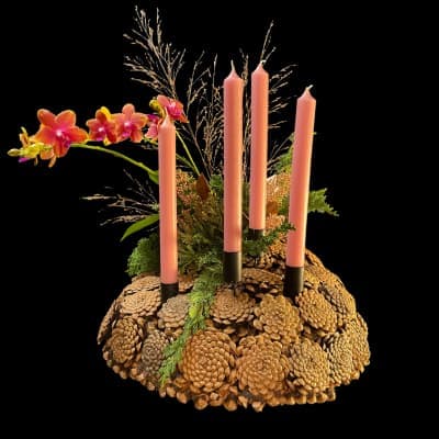 Adventkranz aus einem erhöhten Zapfenteller mit vier Stabkerzen, gepflanzter Orchidee, frischem Tannengrün, kupferfarbenen Gräsern und Skimmia.